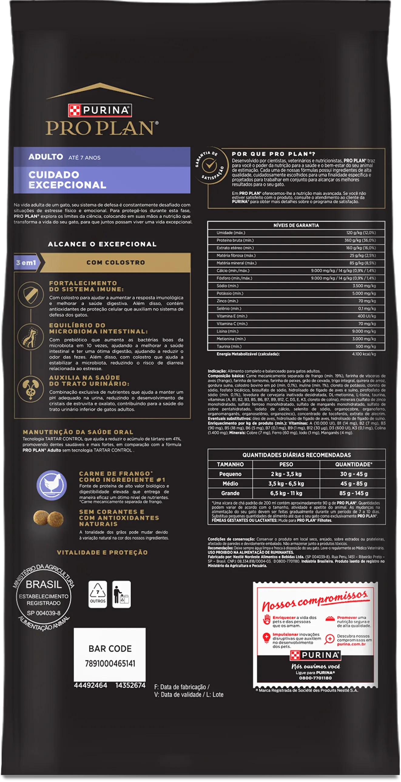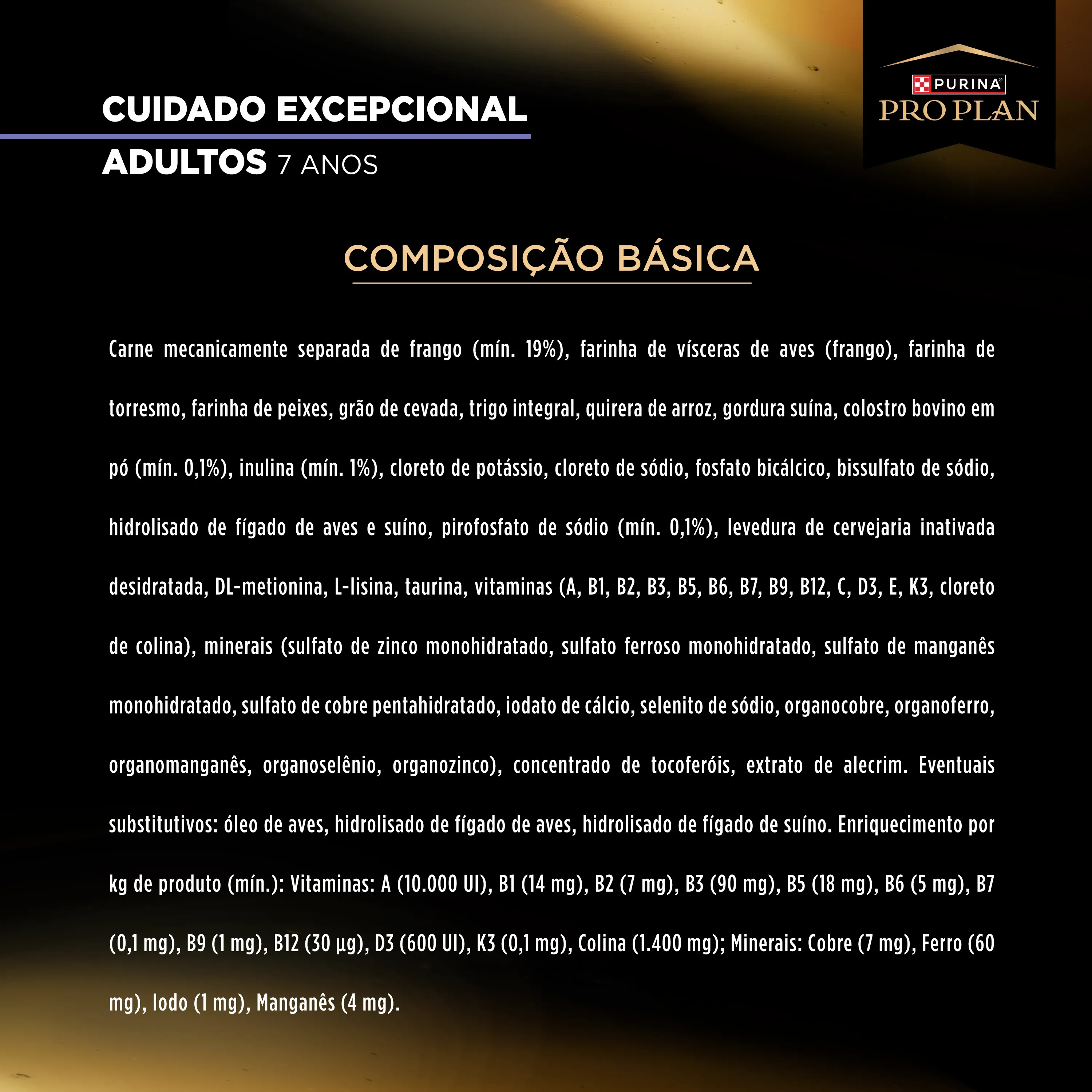 Carne mecanicamente separada de frango (mín. 19%), farinha de vísceras de aves (frango), farinha de torresmo, farinha de peixes, grão de cevada, trigo integral, quirera de arroz, gordura suína, colostro bovino em pó (mín. 0,1%), inulina (mín. 1%), cloreto de potássio, cloreto de sódio, fosfato bicálcico, bissulfato de sódio, hidrolisado de fígado de aves e suíno, pirofosfato de sódio (mín. 0,1%), levedura de cervejaria inativada desidratada, DL-metionina, L-lisina, taurina, vitaminas (A, B1, B2, B3, B5, B6, B7, B9, B12, C, D3, E, K3, cloreto de colina), minerais (sulfato de zinco monohidratado, sulfato ferroso monohidratado, sulfato de manganês monohidratado, sulfato de cobre pentahidratado, iodato de cálcio, selenito de sódio, organocobre, organoferro, organomanganês, organoselênio, organozinco), concentrado de tocoferóis, extrato de alecrim. Eventuais substitutivos: óleo de aves, hidrolisado de fígado de aves, hidrolisado de fígado de suíno.