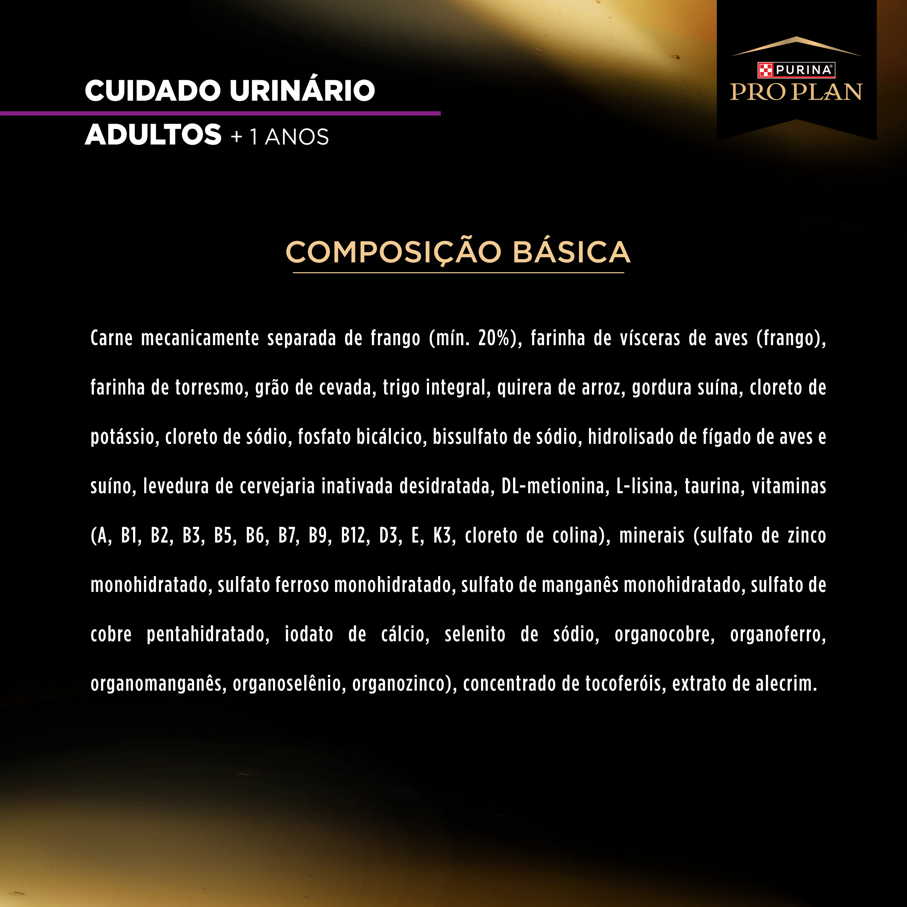Carne mecanicamente separada de frango (mín. 20%), farinha de vísceras de aves (frango), farinha de torresmo, grão de cevada, trigo integral, quirera de arroz, gordura suína, cloreto de potássio, cloreto de sódio, fosfato bicálcico, bissulfato de sódio, hidrolisado de fígado de aves e suíno, levedura de cervejaria inativada desidratada, DL-metionina, L-lisina, taurina, vitaminas (A, B1, B2, B3, B5, B6, B7, B9, B12, D3, E, K3, cloreto de colina), minerais (sulfato de zinco monohidratado, sulfato ferroso monohidratado, sulfato de manganês monohidratado, sulfato de cobre pentahidratado, iodato de cálcio, selenito de sódio, organocobre, organoferro, organomanganês, organoselênio, organozinco), concentrado de tocoferóis, extrato de alecrim. Eventuais substitutivos: óleo de aves, hidrolisado de fígado de aves, hidrolisado de fígado de suíno.