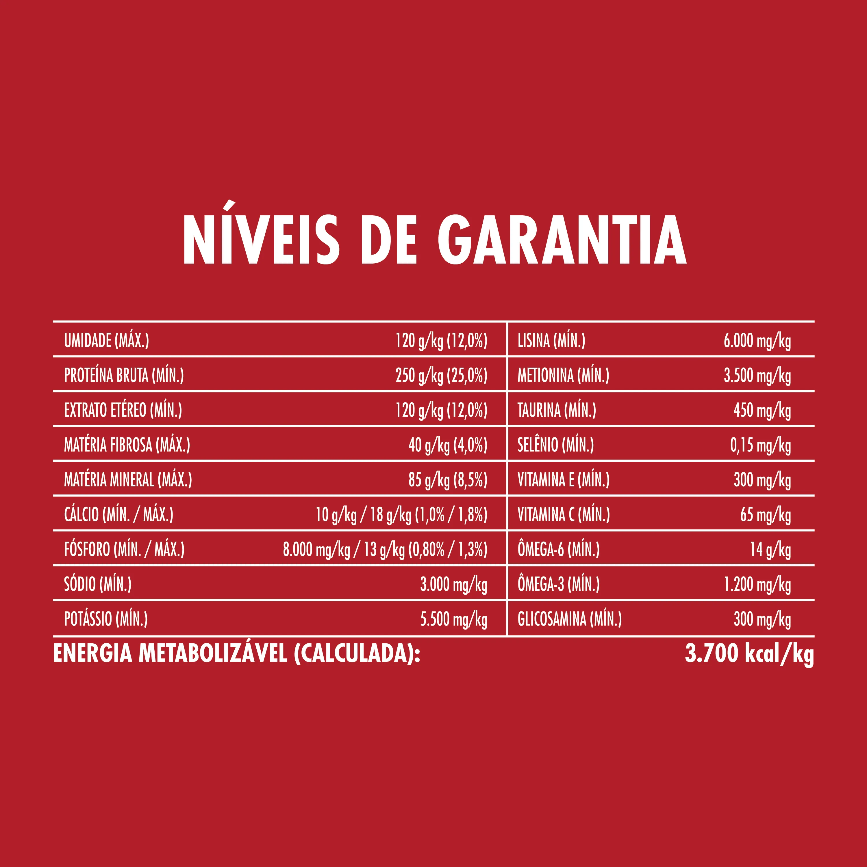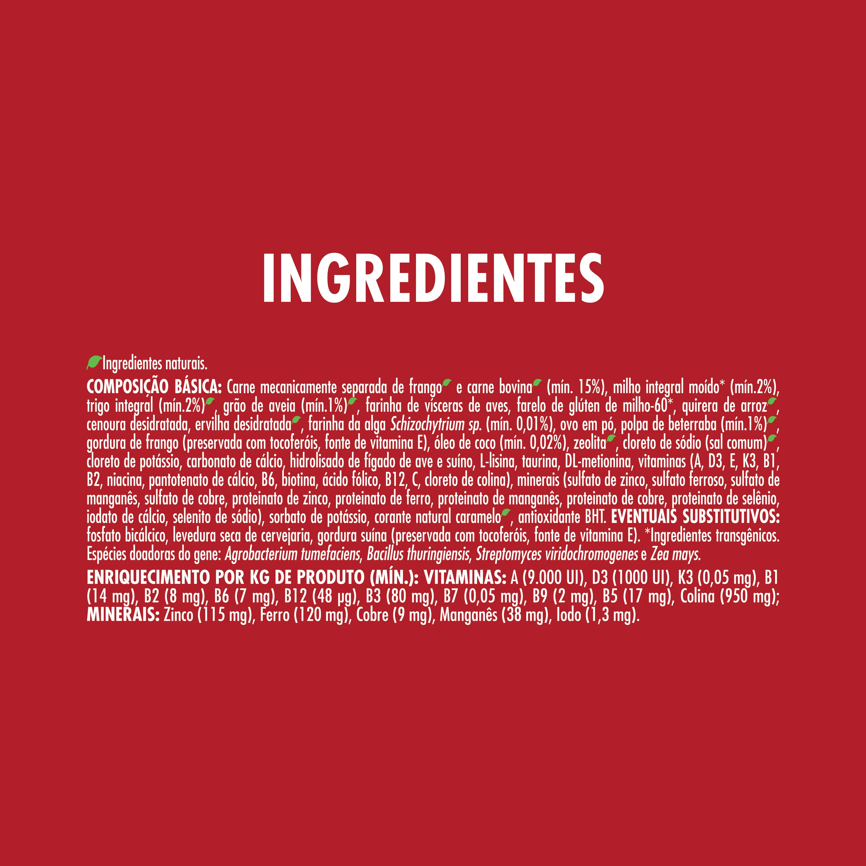 Carne mecanicamente separada de frango e carne bovina (mín. 15%), milho integral moído* (mín.2%), trigo integral (mín.2%) , grão de aveia (mín.1%) , farinha de vísceras de aves, farelo de glúten de milho-60*, quirera de arroz , cenoura desidratada, ervilha desidratada , farinha da alga Schizochytrium sp. (mín. 0,01%), ovo em pó, polpa de beterraba (mín.1%) , gordura de frango (preservada com tocoferóis, fonte de vitamina E), óleo de coco (mín. 0,02%), zeolita , cloreto de sódio (sal comum) , cloreto de potássio, carbonato de cálcio, hidrolisado de fígado de ave e suíno, L-lisina, taurina, DL-metionina, vitaminas (A, D3, E, K3, B1, B2, niacina, pantotenato de cálcio, B6, biotina, ácido fólico, B12, C, cloreto de colina), minerais (sulfato de zinco, sulfato ferroso, sulfato de manganês, sulfato de cobre, proteinato de zinco, proteinato de ferro, proteinato de manganês, proteinato de cobre, proteinato de selênio, iodato de cálcio, selenito de sódio), sorbato de potássio, corante natural caramelo , antioxidante BHT. Eventuais substitutivos: fosfato bicálcico, levedura seca de cervejaria, gordura suína (preservada com tocoferóis, fonte de vitamina E). *Ingredientes transgênicos. Espécies doadoras do gene: Agrobacterium tumefaciens, Bacillus thuringiensis, Streptomyces viridochromogenes e Zea mays.