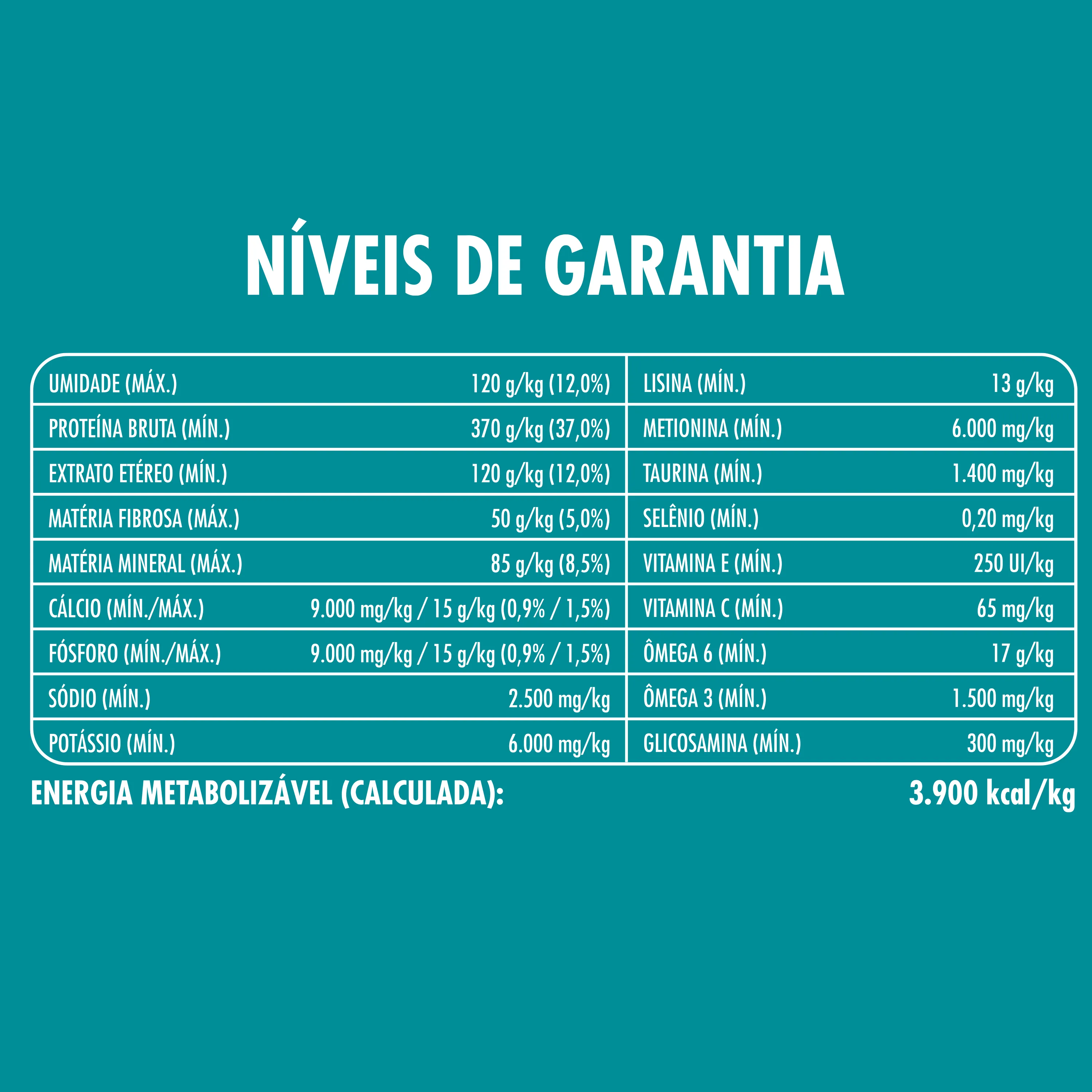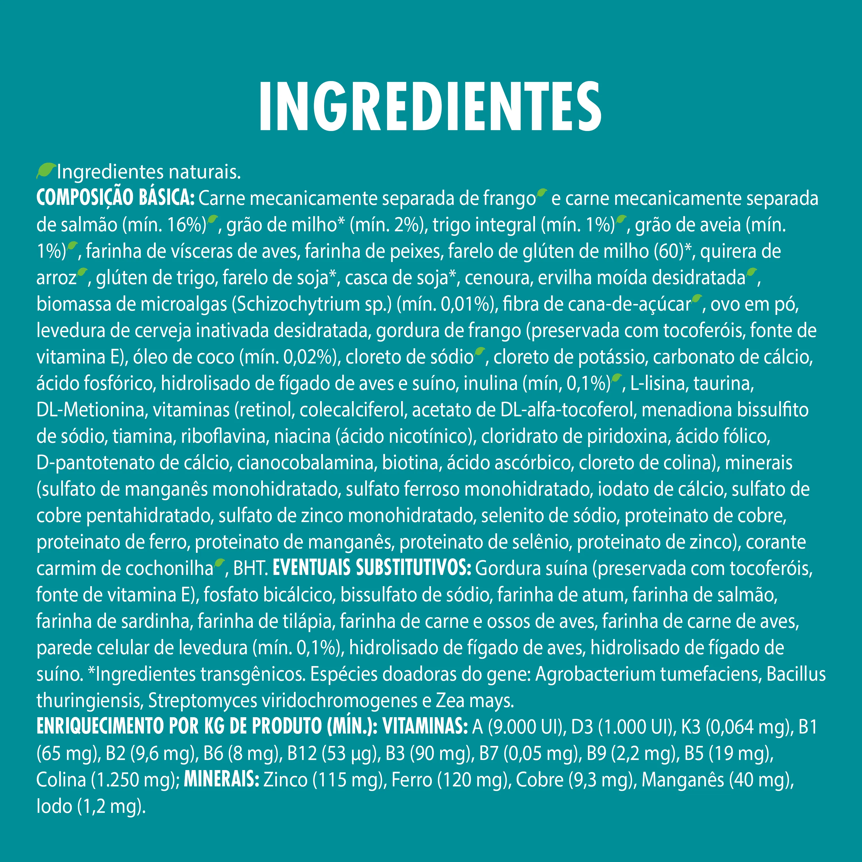 Composição básica: carne mecanicamente separada de frango e carne mecanicamente separada de salmão (mín. 16%) , milho integral moído* (mín. 2%), trigo integral (mín. 1%) , grão de aveia (mín. 1%) , farinha de vísceras de aves, farinha de peixe, farelo de glúten de milho-60*, quirera de arroz , glúten de trigo, farelo de soja*, casca de soja*, cenoura desidratada, ervilha desidratada , farinha da alga Schizochytrium sp. (mín. 0,01%), fibra de cana-de-açúcar , ovo em pó, levedura seca de cervejaria, gordura de frango (preservada com tocoferóis, fonte de vitamina E), óleo de coco (mín. 0,02%), cloreto de sódio (sal comum) , cloreto de potássio, carbonato de cálcio, ácido fosfórico, hidrolisado de fígado de ave e suíno, inulina , L-lisina, taurina, DL-metionina, vitaminas (A, D3, E, K3, B1, B2, niacina, pantotenato de cálcio, B6, biotina, ácido fólico, B12, C, cloreto de colina), minerais (sulfato de zinco, sulfato ferroso, sulfato de manganês, sulfato de cobre, proteinato de zinco, proteinato de ferro, proteinato de manganês, proteinato de cobre, proteinato de selênio, iodato de cálcio, selenito de sódio), corante natural carmim de cochonilha , antioxidante BHT. Eventuais substitutivos: gordura suína (preservada com tocoferóis, fonte de vitamina E), fosfato bicálcico, farinha de atum, farinha de peixe salmão. *Ingredientes transgênicos. Espécies doadoras do gene: Agrobacterium tumefaciens, Bacillus thuringiensis, Streptomyces viridochromogenes e Zea mays.