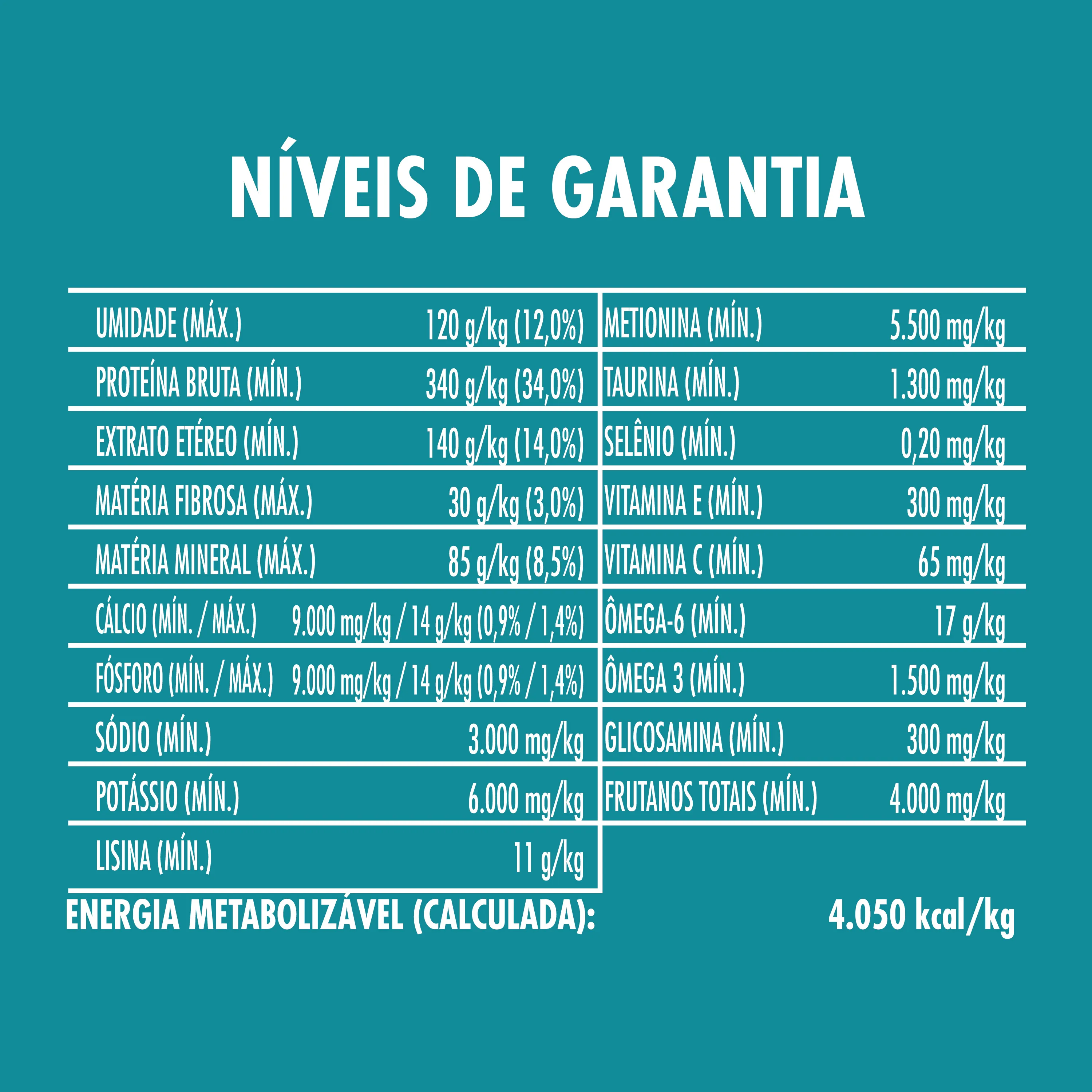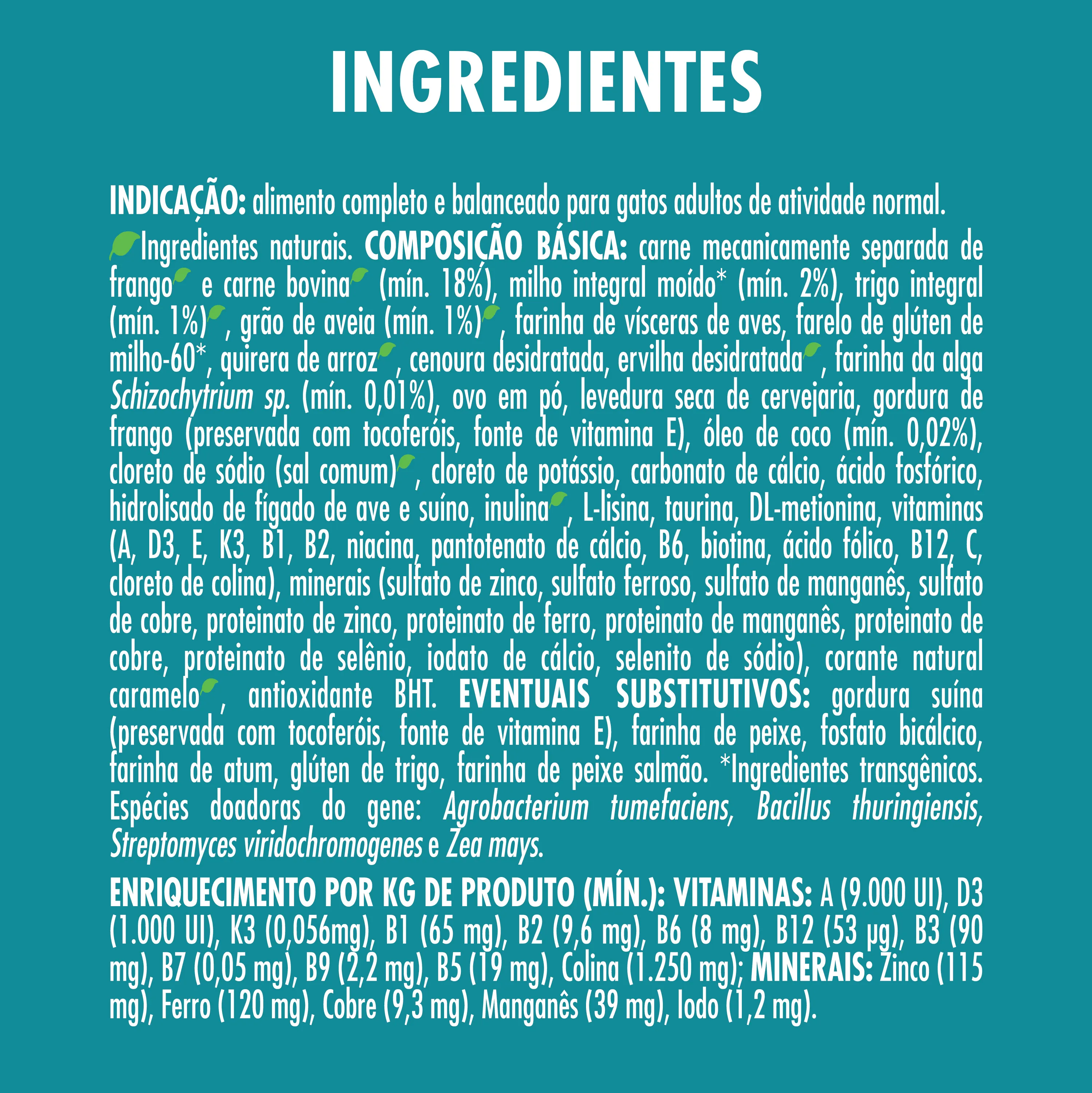 Composição básica: Carne mecanicamente separada de frango e carne bovina (mín. 18%), milho integral moído* (mín. 2%), trigo integral (mín. 1%) , grão de aveia (mín. 1%) , farinha de vísceras de aves, farelo de glúten de milho-60*, quirera de arroz , cenoura desidratada, ervilha desidratada , farinha da alga Schizochytrium sp. (mín. 0,01%), ovo em pó, levedura seca de cervejaria, gordura de frango (preservada com tocoferóis, fonte de vitamina E), óleo de coco (mín. 0,02%), cloreto de sódio (sal comum) , cloreto de potássio, carbonato de cálcio, ácido fosfórico, hidrolisado de fígado de ave e suíno, inulina , L-lisina, taurina, DL-metionina, vitaminas (A, D3, E, K3, B1, B2, niacina, pantotenato de cálcio, B6, biotina, ácido fólico, B12, C, cloreto de colina), minerais (sulfato de zinco, sulfato ferroso, sulfato de manganês, sulfato de cobre, proteinato de zinco, proteinato de ferro, proteinato de manganês, proteinato de cobre, proteinato de selênio, iodato de cálcio, selenito de sódio), corante natural caramelo , antioxidante BHT. Eventuais substitutivos: gordura suína (preservada com tocoferóis, fonte de vitamina E), farinha de peixe, fosfato bicálcico, farinha de atum, glúten de trigo, farinha de peixe salmão. *Ingredientes transgênicos. Espécies doadoras do gene: Agrobacterium tumefaciens, Bacillus thuringiensis, Streptomyces viridochromogenes e Zea mays.
