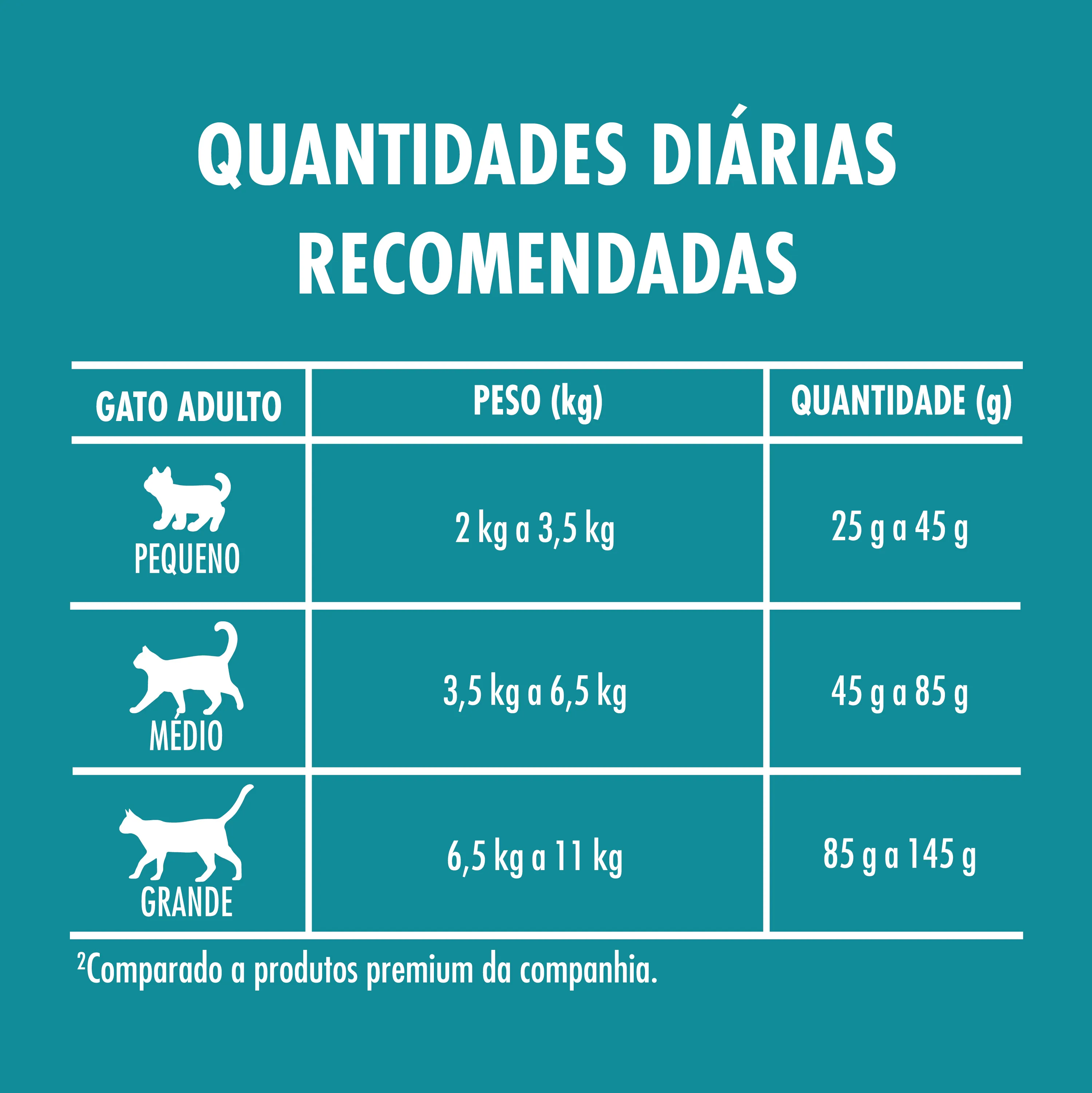- Alimento super premium, completo e balanceado, destinado a gatos adultos de todos os tamanhos.