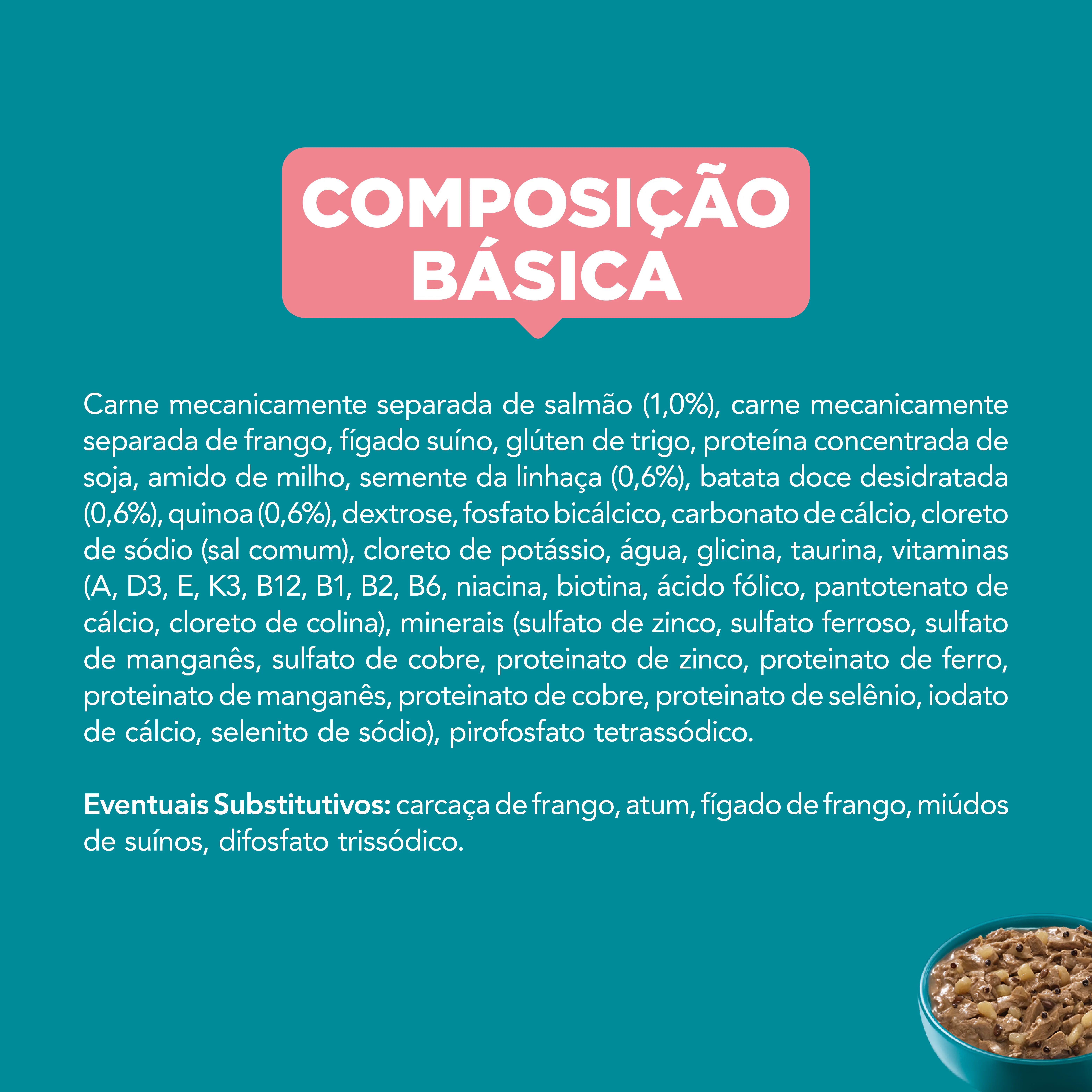 Carne mecanicamente separada de salmão (1,0%), carne mecanicamente separada de frango, figado suíno, glúten de trigo, proteína concentrada de soja, amido de milho, semente da linhaça (0,6%), batata doce desidratada (0,6%), quinoa (0,6%), dextrose, fosfato bicálcico, carbonato de cálcio, cloreto de sódio (sal comum), cloreto de potássio, água, glicina, taurina, vitaminas (A, D3, E, K3, B12, B1, B2, B6, niacina, biotina, ácido fólico, pantotenato de cálcio, cloreto de colina), minerais (sulfato de zinco, sulfato ferroso, sulfato de manganês, sulfato de cobre, proteinato de zinco, proteinato de ferro, proteinato de manganês, proteinato de cobre, proteinato de selênio, iodato de cálcio, selenito de sódio), pirofosfato tetrassódico.